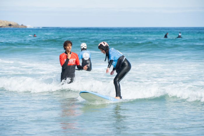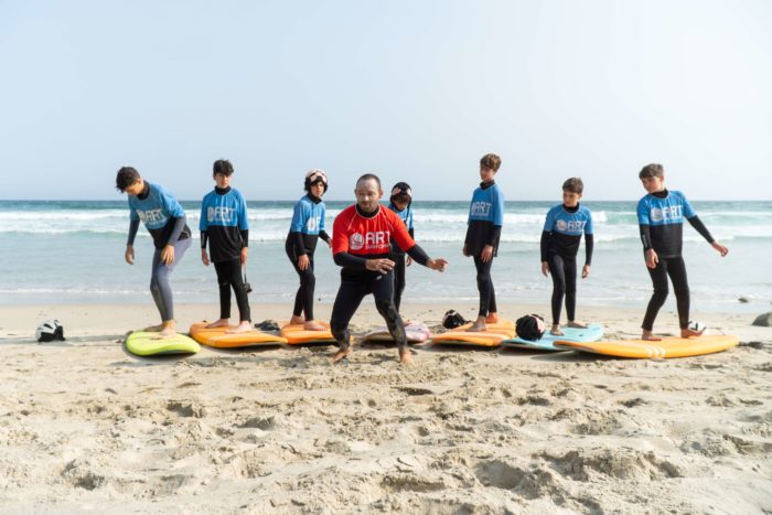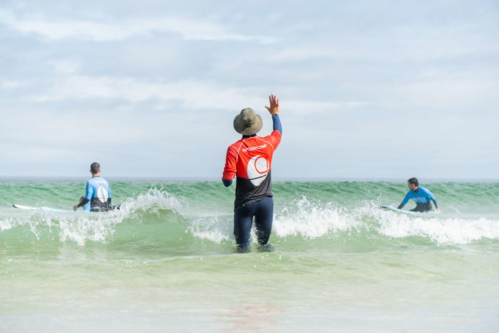 Calentar antes de entrar en el agua es importante: No hace falta hacer una sesión de crossfit antes de surfear, pero calentar y estirar bien los músculos antes de meterte en el agua te ayudará a surfear mejor. Es importante que la escuela inculque esto a los alumnos desde el primer día. Dicho esto, a surfear solo se aprende en el agua, así que, aunque sea tu primer día tienes que mojarte, si una escuela te dice lo contrario … desconfía.