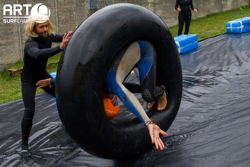 El tarp surfing, el slalom de longskate y por supuesto el urban surfing estuvieron entre nuestras actividades paralelas con más diversión de los campamentos de surf de agosto. En el urban surfing seguimos probando formas imposibles de deslizarnos rampa abajo con el chorro de agua a bordo de colchonetas, tablas, neumáticos…