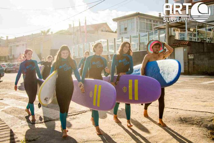 Llegamos a la estación de tren y vimos a un tipo con la camiseta de Art surfcamp que iba descalzo. Nos entraron ganas de descalzarnos a nosotras también. Al llegar al surf camp nos entraron ganas de surfear de inmediato al ver la playa de Razo y el buen ambiente que se respiraba.