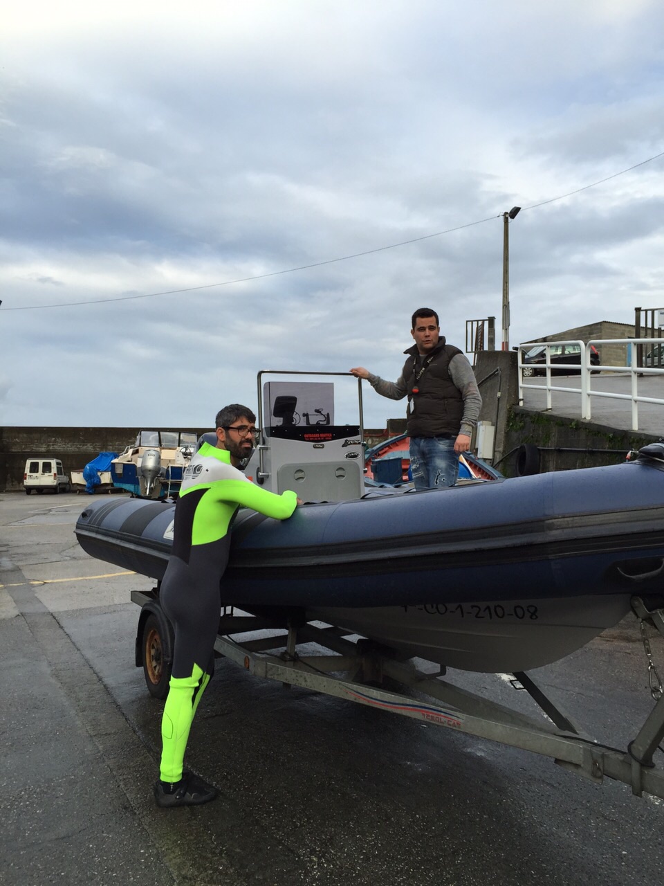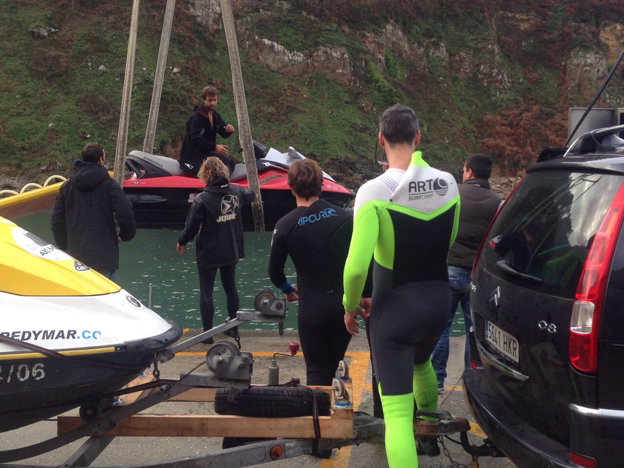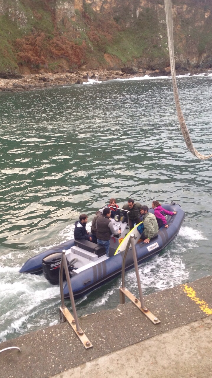 El día prometía: mar de 4 metros, buen viento y con un periodo muy alto, aseguraban nuestra emoción. Salimos del puerto ya avanzada la tarde con Miguel Rojo, que es un gran conocedor de la zona y quien dirige la Zodiac, de acompañantes vamos Brian, Oti Pablo, Manu, Betty y Josecho para ver y fotografiar las olas de cerca. Patas nos hace la cobertura con la grúa para subir y bajar y Jerome y Axi en la moto.
